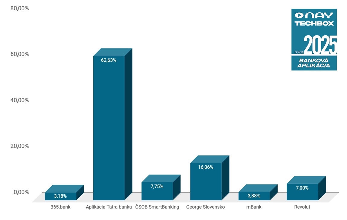 Poznáme aj NAY TECHBOX BANKOVÚ APLIKÁCIU roka 2025, pričom najviac Slovákov opäť za najlepšiu z najlepších zvolilo aplikáciu Tatra banka. Banková aplikácia obhájila prvú priečku z ročníka 2024 a získala až 62,63 % hlasov vo svojej kategórii, čo je celkovo opäť najviac platných hlasov v rámci celej ankety! Poradie aplikácií v TOP3 sa tu taktiež nemenilo, a tak vidíme na 2. priečke aplikáciu George Slovensko od Slovenskej Sporiteľne, ktorá navýšila svoj percentuálny podiel na 16,06 %. Aplikácia ČSOB SmartBanking naopak ušla štvrtej priečke len tesne o 177 hlasov, zaujala7,75 % Slovákov.