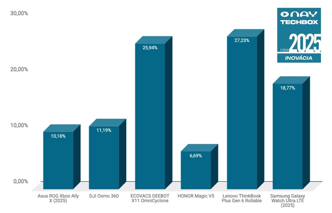 Každoročne je práve kategória NAY TECHBOX INOVÁCIA ukážkou toho, čo by si technologickí nadšenci najviac z TECH trendov priali. Po športových hodinkách s inteligentnými funkciami tak máme na stupni víťazov notebook s rolovacím displejom. Lenovo ThinkBook Plus Gen 6 Rollable si tak zaslúži ocenenie NAY TECHBOX INOVÁCIA ROKA 2025 vďaka zisku 27,23 % hlasov vo svojej kategórii. Druhá priečka patrí špičkovému robotickému vysávaču ECOVACS DEEBOT X11 OmniCyclone, hlasovalo zaň až 25,94 % Slovákov. Do TOP3 sa dostali aj najnovšie hodinky Samsung Galaxy Watch Ultra LTE (2025), a to vďaka zisku 18,77 %.
