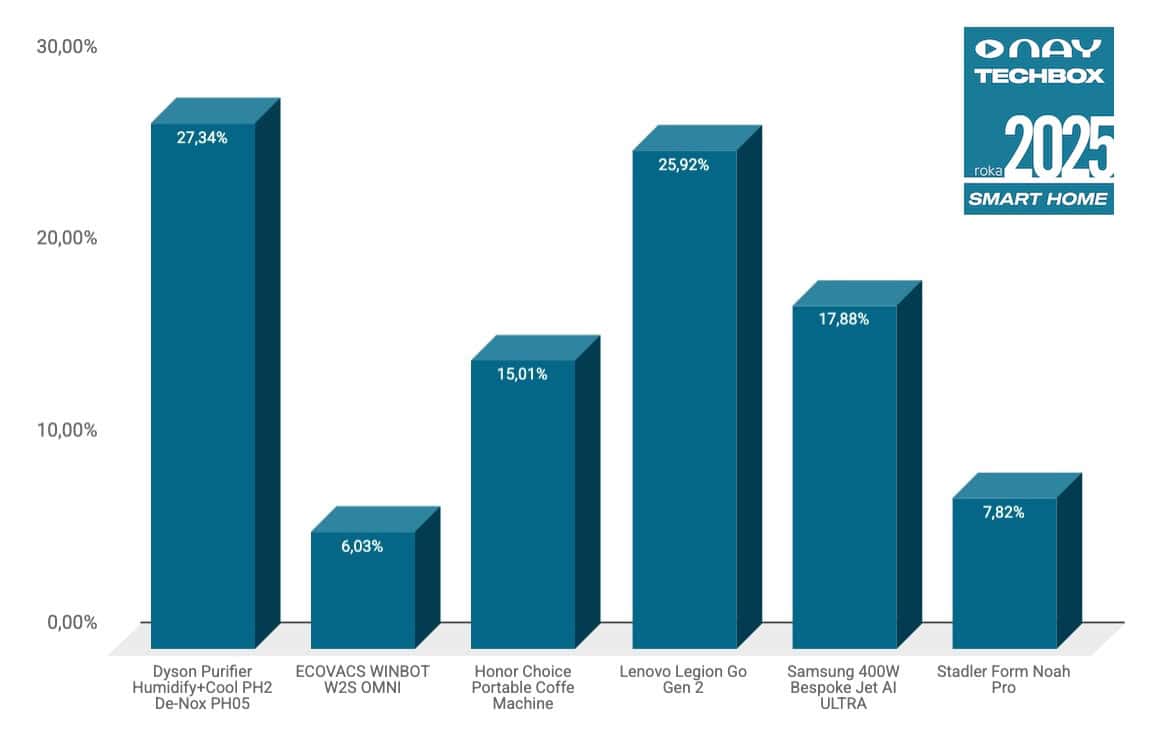 Našli sme aj nového víťaza NAY TECHBOX SMART HOME roka 2025. Kategóriu ovládol Dyson Purifier Humidify+Cool PH2 De-Nox PH05, ktorý je štýlovou kombináciou čističky, zvlhčovača a ventilátora v jednom. V ankete zaň hlasovalo 27,34 % Slovákov. Veľmi tesne sa na 2. mieste umiestnila herná konzola do domácnosti Lenovo Legion Go Gen 2 so ziskom 25,92 % hlasov. Čistota rozhodne patrí k modernej domácnosti, v porovnaní s predchádzajúcim ročníkom, to dokazuje aj tyčový vysávač Samsung 400W Bespoke Jet AI ULTRA, ktorý oslovil 17,88 % hlasujúcich v kategórii SMART HOME.