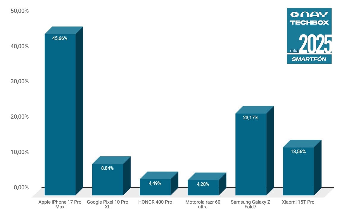 Po tom, čo v roku 2019 Apple iPhone 11 Pro Max zosadil z trónu kategórie SMARTFÓN modely Samsung, prvenstvo si už nepustil a obhájil ho aj v najnovšom ročníku ankety s najnovšou generáciou Apple iPhone 17 Pro Max. Titul NAY TECHBOX SMARTFÓN roka 2025 získal vďaka 45,66 % hlasov, konkrétne zaň hlasovalo 9 727 Slovákov. Skladací smartfón je taktiež stále atraktívny, v aktuálnom ročníku zaň hlasovalo 23,17 % Slovákov, a tak sa na 2. mieste umiestnila najnovšia generácia Samsung Galaxy Z Fold7. Žiadne prekvapenia v TOP3 sa v kategórii SMARTFÓN nekonali, a tak na 3. mieste nájdeme Xiaomi 15T Pro, nástupcu minuloročného modelu, ktorý oslovil 13,56 % hlasujúcich v kategórii.