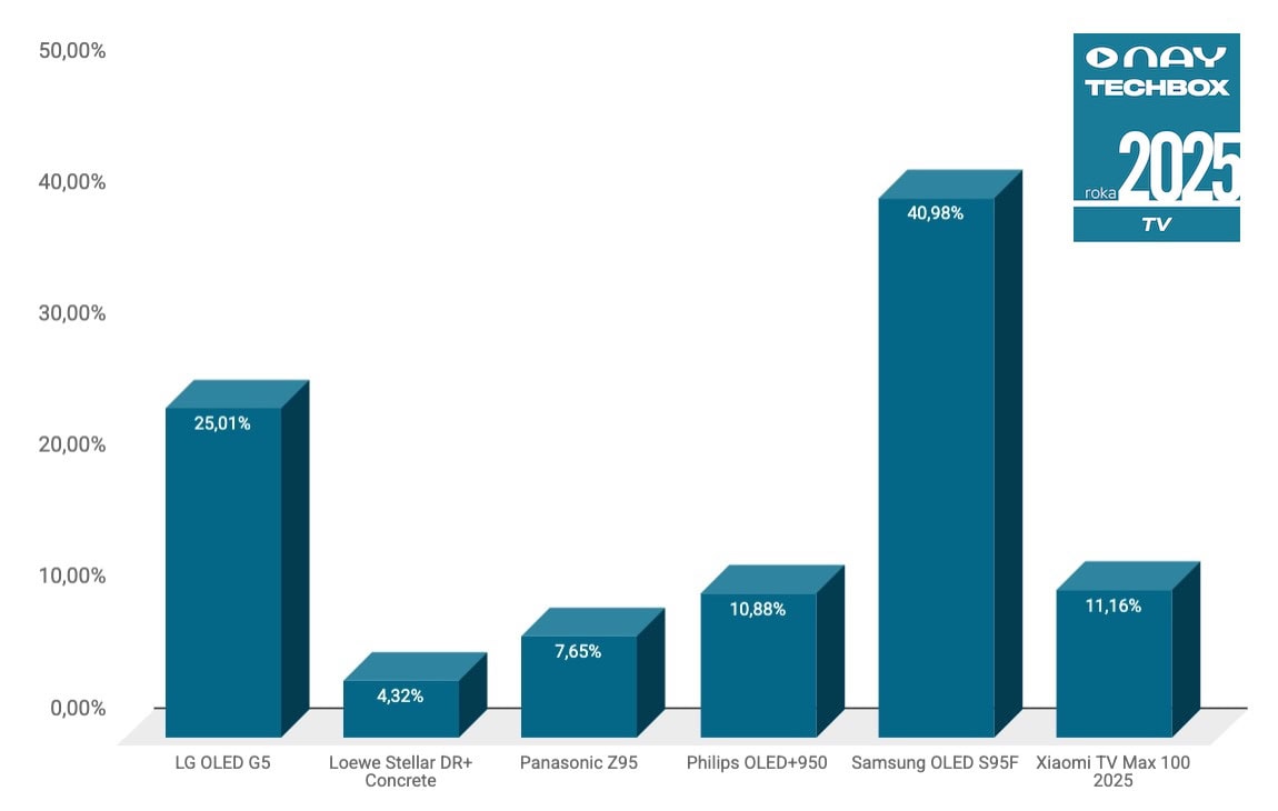 Kategórii TV už od vzniku ankety, celých 15 rokov, kraľuje výrobca Samsung, ktorého OLED televízor opäť získava titul NAY TECHBOX TV ROKA 2025. Samsung OLED S95F dominuje s výsledkom 40,98 %. Druhé miesto patrí televízoru LG, ktorý sa do TOP3 vracia vo veľkom štýle s modelom LG OLED G5 a ziskom 25,01 % hlasov. Aj na tretej priečke máme nováčika, medzi najlepšími sa totiž umiestnil obrovský 100-palcový televízor – Xiaomi TV Max 100 2025, za ktorý hlasovalo 11,16 % Slovákov v kategórii TV.