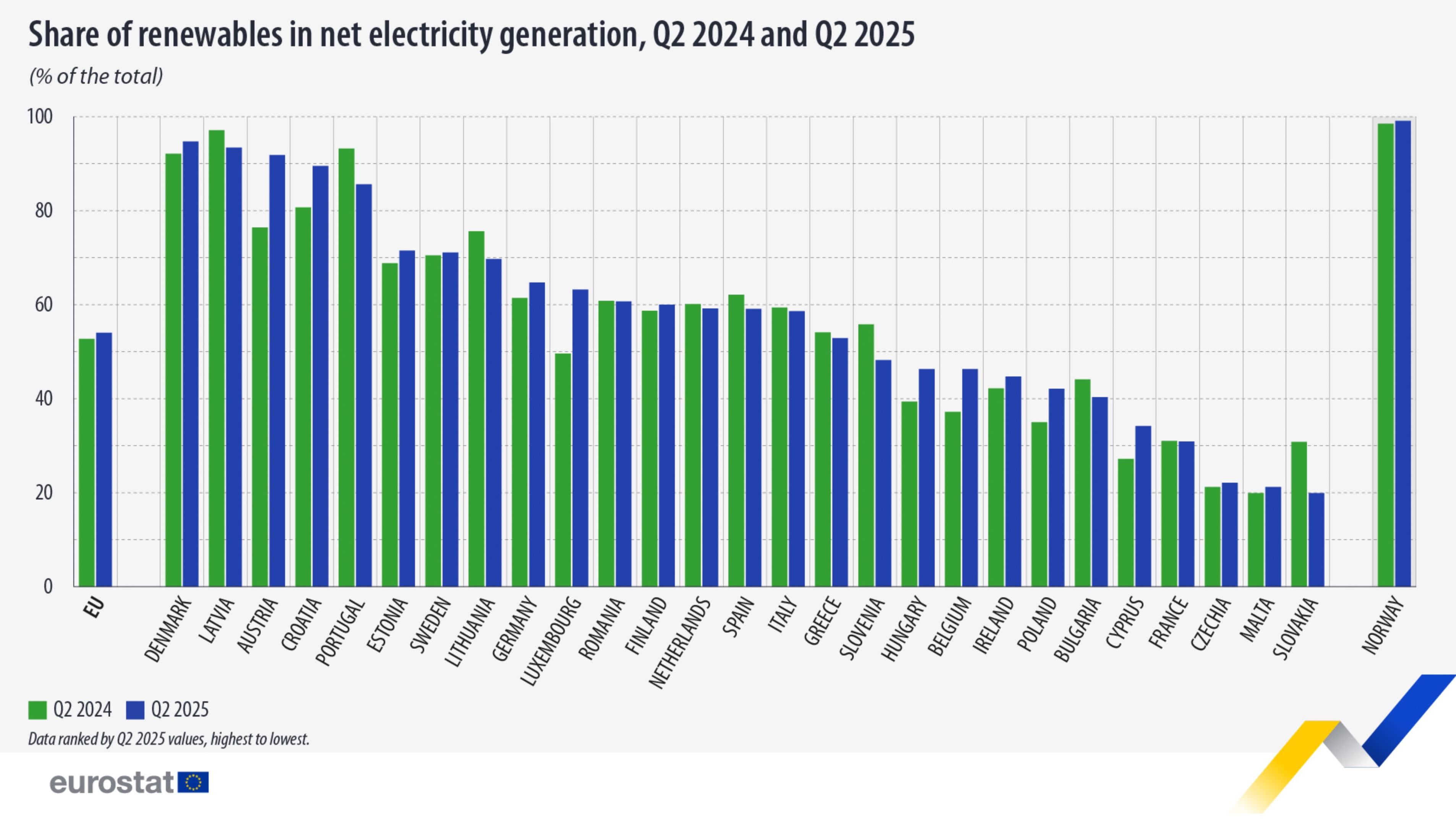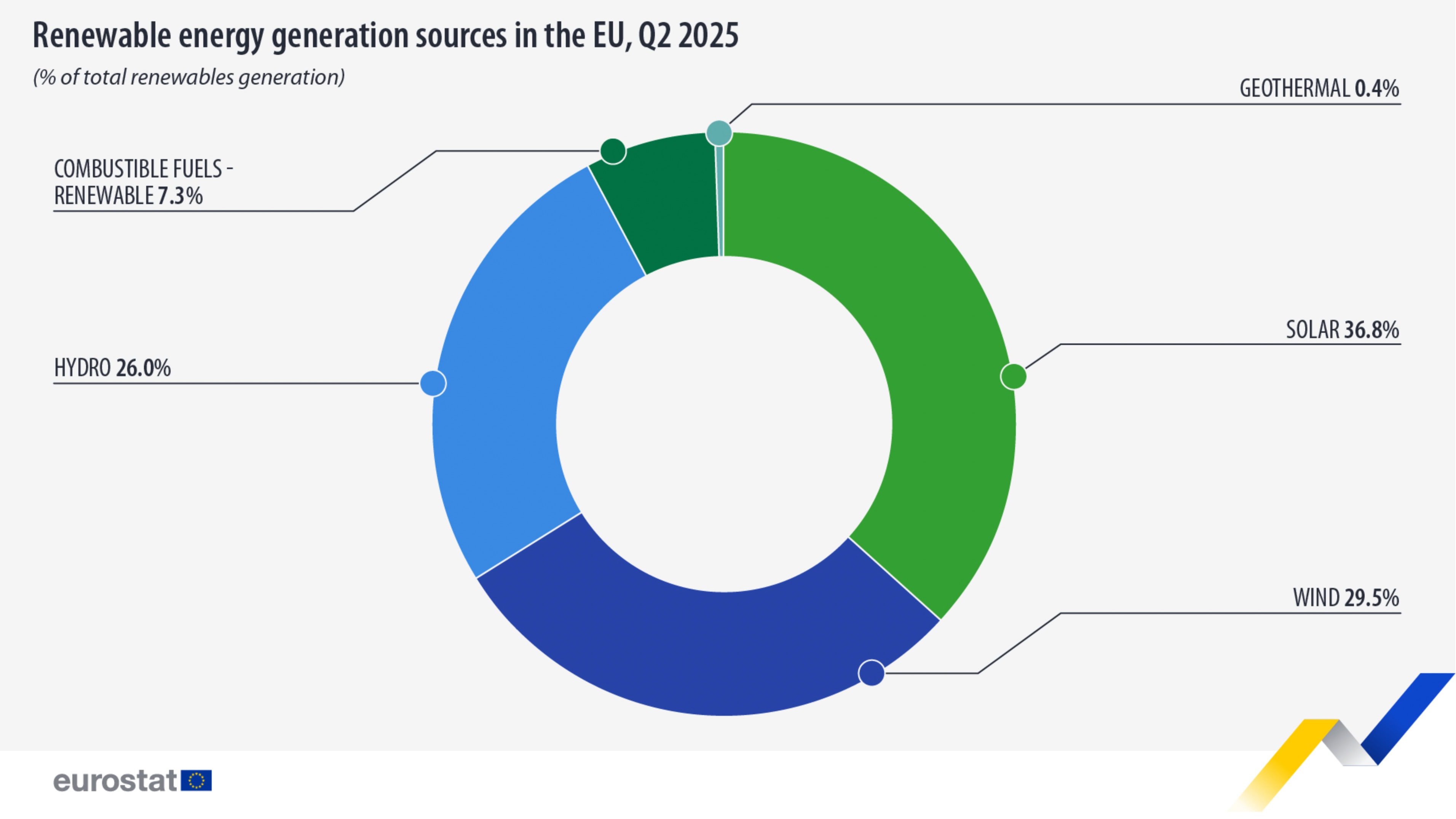 Podľa čerstvých údajov dosiahol v druhom štvrťroku 2025 podiel obnoviteľných zdrojov na čistej vyrobenej elektrine v celej EÚ úctyhodných 54,0 %, čo predstavuje istý nárast oproti 52,7 % v rovnakom období minulého roka. Historický prelom nastal v júni 2025, kedy sa hlavným zdrojom elektriny v Únii stala solárna energia s podielom 22,0 %, čím predbehla jadro (21,6 %), vietor (15,8 %), vodu (14,1 %) aj zemný plyn (13,8 %).