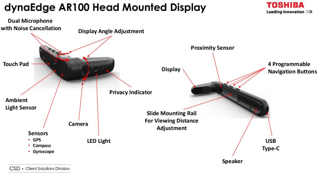 Zatiaľ čo Google Glass sa mali čo najviac priblížiť nenápadným okuliarom, Toshiba ku nim pribalila aj malú krabičku. Zariadenie tak tvorí kombinácia prenosného počítača dynaEdge DE-100 a displej dynaEdge AR100 Head Mounted Display.