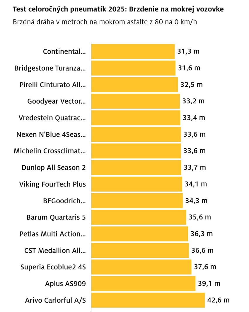 Pre vodičov, ktorí nechcú meniť sady podľa sezóny a hľadajú kompromis medzi letom i zimou v jedných plášťoch, patria tieto tri modely určite medzi najrozumnejšie voľby v teste ADAC 2025. Ak ide o bezpečnosť, či nebodaj zdravie – nie je čo riešiť. Jasne to dokazuje aj brzdná dráha. Medzi najlepšou pneumatikou (Continental) a najhoršou (Arivo Carlorful A/S) je neuveriteľných 11,3 metrov!