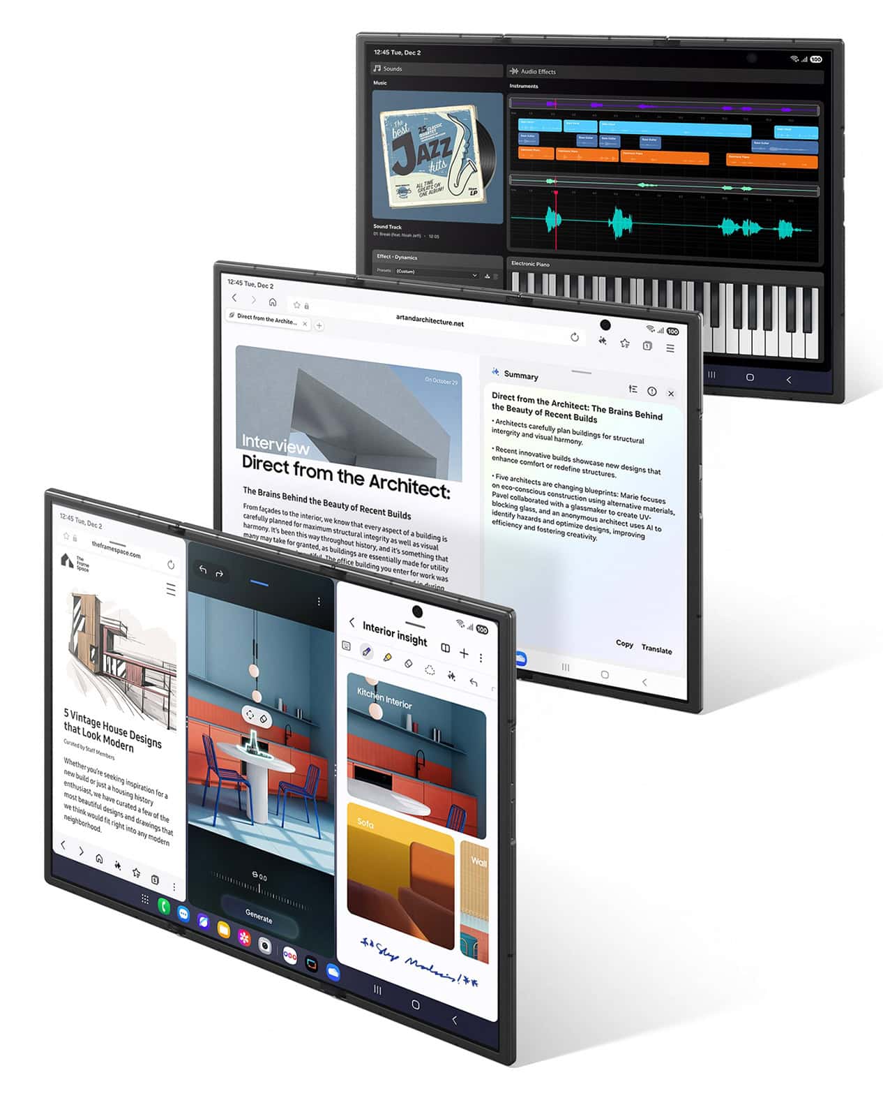 Možné má byť pritm ľubovoľne meniť veľkosti okien a usporiadanie. Zásadnou novinkou je, že TriFold je prvý mobilný telefón so samostatným režimom Samsung DeX priamo na obrazovke tabletu. V tomto režime sa prostredie zmení na desktopové a umožňuje spravovať až štyri pracovné plochy s piatimi aplikáciami naraz, pričom pripojením externej klávesnice a myši vzniká plnohodnotná pracovná stanica.