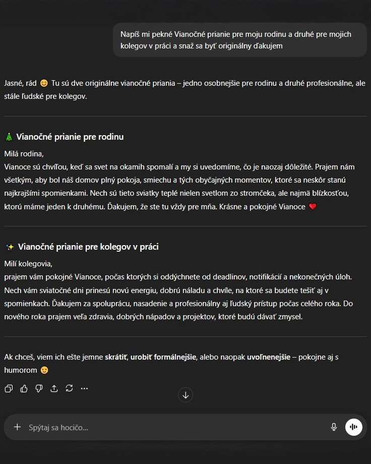 AI totiž nemusíte používať len na technické otázky alebo hľadanie informácií. Dokáže pomôcť aj s úplne bežnými vecami, ako je formulovanie vianočného priania. Stačí jej povedať, komu je text určený a aký tón chcete zvoliť.
