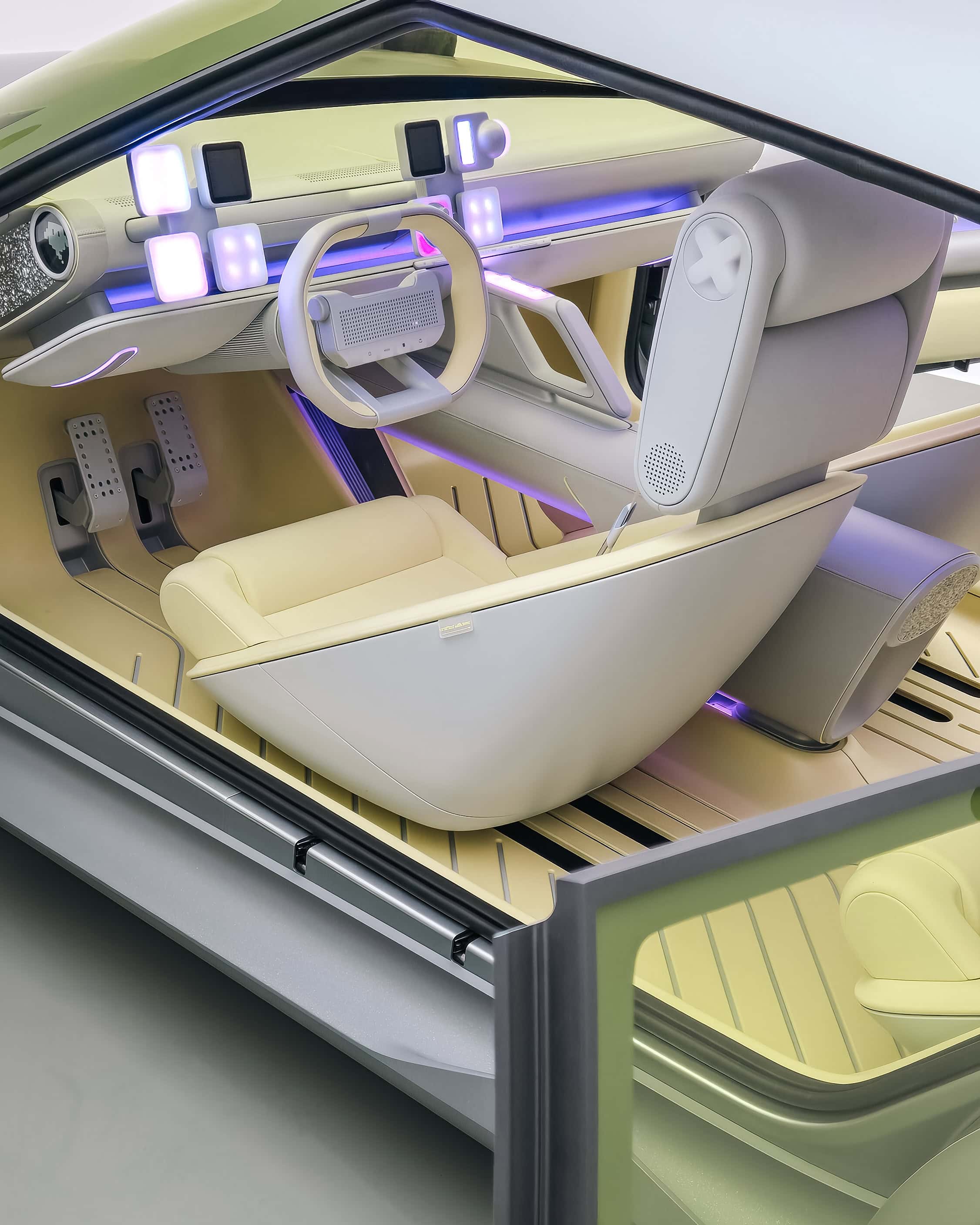 Absolútne prekvapí interiér, kde by ste zbytočne hľadali veľký displej uprostred palubnej dosky, resp. displeje pozdĺž palubnej dosky, ako je to dnes pri modeloch výrobcu zvykom. V tomto prípade koncept ukázal úplne nové rozloženie ukazovateľov, ktoré tvorí dvojica štyroch mini displejov/prvkov, ktoré sa mechanicky pohybujú a zároveň dokážu počas jazdy ukázať rôzne parametre. Malo by to byť maximálne prispôsobiteľné a dobrou správou je, že tieto prvky sú vám neustále na očiach, nachádzajú sa totiž za volantom.