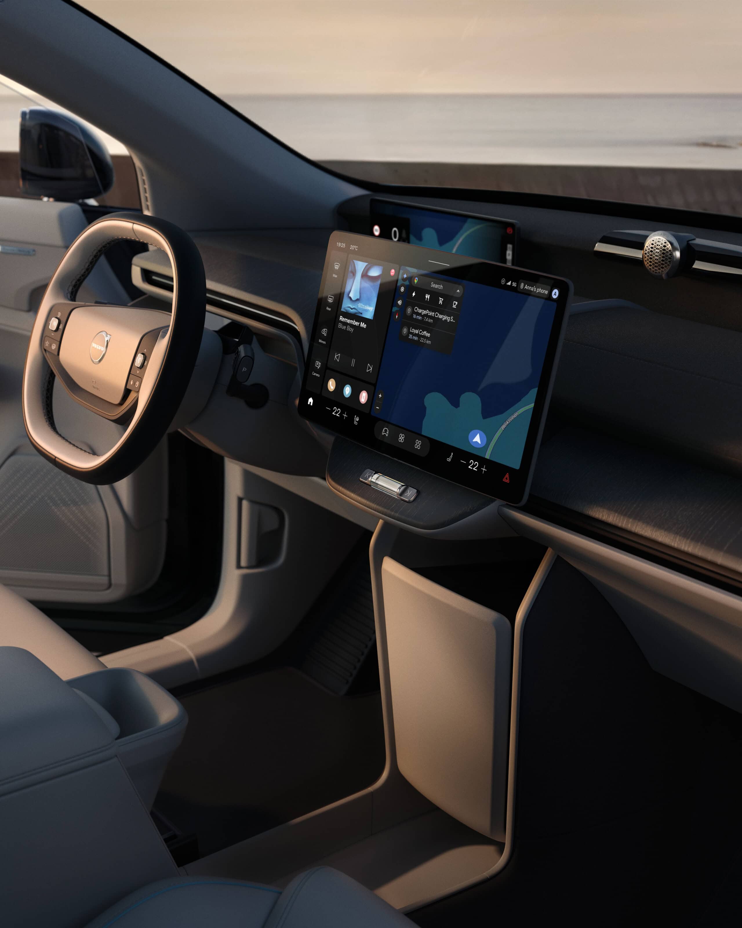V interiéri EX60 dominuje 15-palcový centrálny displej s operačným systémom postaveným na Google Automotive. To znamená, že navigácia Mapy Google, hlasové ovládanie či prístup k aplikáciám sú súčasťou štandardu. Volvo v základe ponúka aj kvalitné materiály, pričom namiesto kože využíva ekologický materiál Nordico.