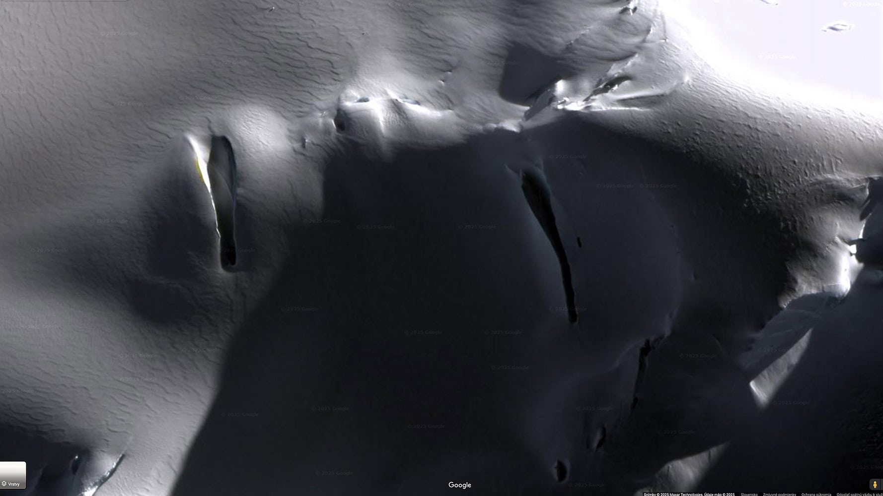 Tento útvar pripomínajúci obrovskú zlomenú ľudskú tvár upútal pozornosť používateľov služby Mapy Google. Zlomená tvár vyvolala nespočetné množstvo teórií, pričom niektoré špekulujú o starovekých civilizáciách alebo skrytých vojenských operáciách pod antarktickým ľadom.